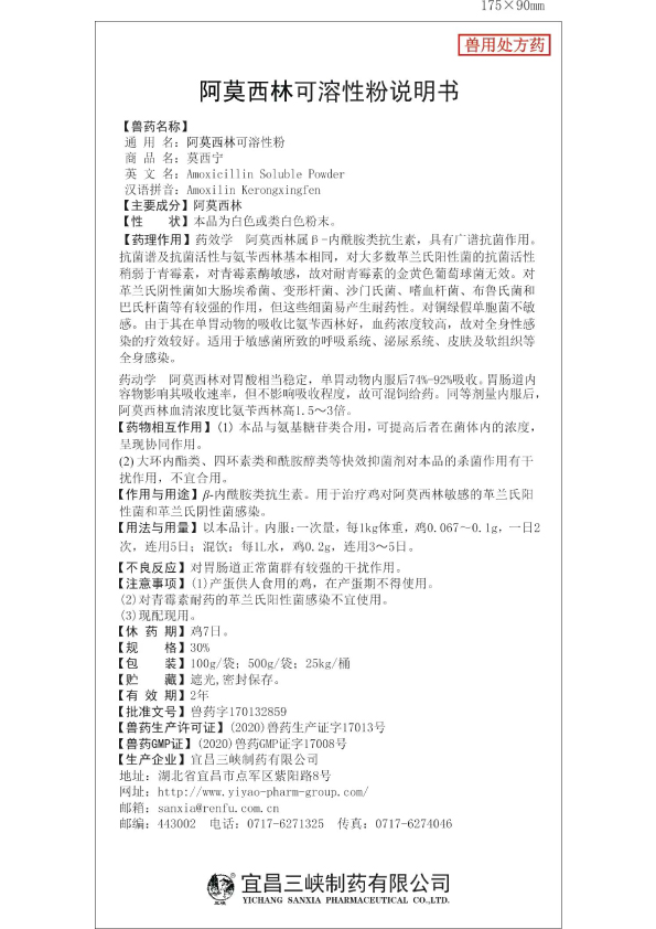 用于治疗鸡对阿莫西林敏感的革兰氏阳性菌和革兰氏阴性菌感染。